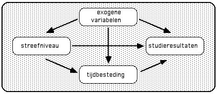 De wetgever hecht grote waarde aan studielast en numeriek rendement als aanwijzingen of zelfs als bepalend voor de effectiviteit en de kwaliteit van het onderwijs. Voor zowel studielast als numeriek rendement laat zich de vraag stellen welke hoogte ervan in een gegeven onderwijssituatie als optimaal kan worden beschouwd. Onmiddellijk volgende vragen zijn dan: welke factoren zijn van invloed op het al dan niet bereiken van een dergelijk optimaal niveau. De wetgever veronderstelt dat het mogelijk is in het onderwijs sturend op te treden op een dusdanige wijze dat een optimaal niveau van studielast en numeriek rendement wordt bereikt, maar is onvolledig in het aangeven van de daartoe te hanteren instrumenten. Voor sturend ingrijpen in het onderwijs is een voorwaarde dat men zicht heeft op de factoren die bepalend zijn voor studielast en numeriek rendement, en wat de aard van dergelijke oorzakelijke relaties is. In dit onderzoek wordt aandacht besteed aan mogelijke oorzakelijke samenhangen. Een eenvoudig studieresultatenmodel, ontleend aan Tromp en Wilbrink (1977), wordt gebruikt om vraagstellingen te structureren en gegevens te ordenen. Het is met name het heuristische gebruik van het model waar het hier om gaat, niet zozeer de kwantitatieve bewerkingen op empirische gegevens (onderwerp van mogelijke latere modelstudies). Het model beschrijft op spaarzame wijze de onderlinge samenhangen tussen studieresultaten, tijdbesteding, streefniveau (motivatie), en biografische gegevens (vooropleiding, capaciteiten, e.d.), zie onderstaande figuur.